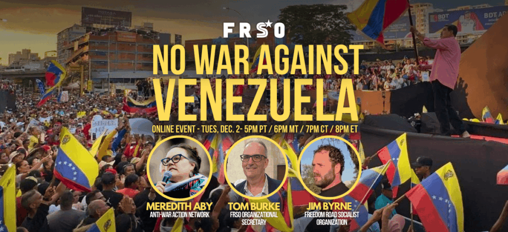 Join leading anti-war activists and FRSO leaders for an online event on building the movement against war on Venezuela. Speakers will include Meredith Aby of the Anti-War Action Network; Tom Burke, FRSO Organizational Secretary; and Jim Byrne, FRSO member & anti-war activist.