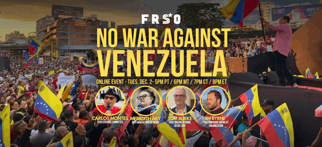 Join leading anti-war activists and FRSO leaders for an online event on building the movement against war on Venezuela. Speakers will include Carlos Montes, FRSO Central Committee; Meredith Aby of the Anti-War Action Network; Tom Burke, FRSO Organizational Secretary; and Jim Byrne, FRSO member & anti-war activist.